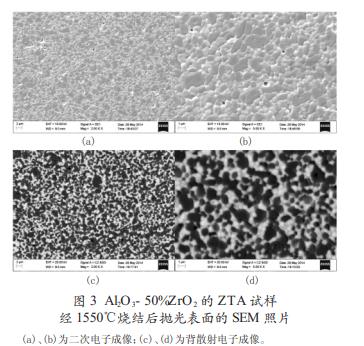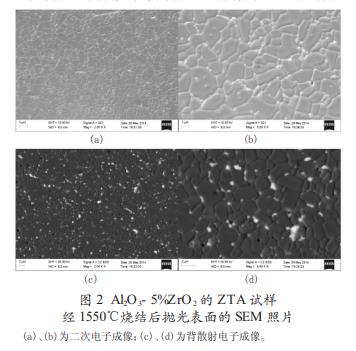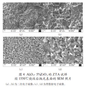 ⑵5%ZrO2 的 ZTA 与 50%ZrO2 的 ZTA 的相对密度分别达到 97.6%和 94.2%,50%ZrO2 的 ZTA 的相对密度较低,有可能是过烧导致的。