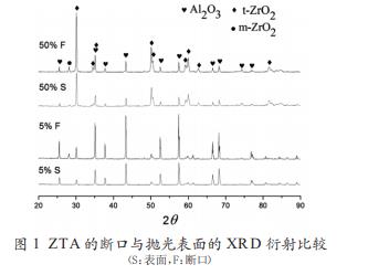 ②对试件进行磨平、抛光加工时,外力使四方相氧化锆相变成单斜相氧化锆。如图 1 所示,50%的 ZTA 断口处的单斜相氧化锆含量增加(这可以对比 2θ=26°的氧化铝峰高得出),这表明在应力作用下,四方相氧化锆有一定的相变量,氧化锆的掺入能起到一定的增强增韧作用。