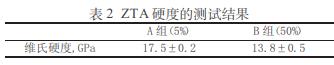 如图 6 所示,5%的 ZTA 的压痕面积明显比 50%的ZTA 的压痕面积小,也直观地说明了随着氧化锆含量的增多,ZTA 的硬度下降。