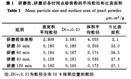 2.1IPSA检测结果从表1、图1可以看出,未经研磨的珍珠粉、研磨后各时间点珍珠粉粒度分布近似正态分布。原样珍珠粉的粒度较大,粒度分布较宽.峰型较宽而低,比个面积较小,平均粒径较大,属于微米级范围,经研磨30min、60rain、90rain各时间点珍珠粉粒径分布不断缩窄.峰型不断变窄而尖锐。高峰位向左移动,平均粒径不断减少,比表面积不断增加趋势;然而经研磨120min后的珍珠粉的粒径分布曲线与研磨6Omin后珍珠粉分布曲线几乎重叠,与90min相比.峰型变宽而低,平均粒径增加,比表面积减少,即当珍珠粉研磨到一定粒度后,颗粒粒径大小会现逆向发展。