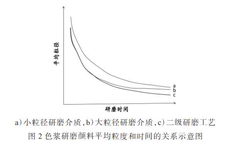 颜料的平均粒径降低很快,但当颜料的粒径达到一定 细度时,研磨效率明显下降。因此研磨时非常有必要根据研磨过程中粒径的变化,分阶段选取合适粒径的 研磨介质,如图2c 所示,前期选择大粒径锆珠,可以 快速降低颜料的粒径,当达到一定细度时,选取较小 的研磨介质,可以进一步实现颜料的粒径快速降低。