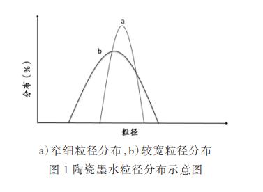 陶瓷墨水中颜料平均粒径要求在200 ~ 400 nm 之 间,最大粒径小于1 μm。然而陶瓷颜料的超细化不仅 加工成本高、技术难度大,并且在一定程度上破坏了 颜料的晶体结构,降低了墨水发色效果,因此在控制 平均粒径接近的情况下,尽可能控制窄细的粒径分 布。因为,陶瓷墨水中颜料粒径越大越容易沉淀,粒径 越小发色越弱。因此为了提高墨水的发色效果和储存 稳定性,尽可能的制备粒径大和粒径分布窄细的颜料 粒径分布色浆。如图1 所示,图1a 表示窄细粒径分布 的陶瓷色浆,图1b 表示较宽粒径分布的色浆,因此图 1a 是陶瓷墨水制备过程中尽可能要达到的目标,因为 粒度越大,粒径分布越集中,陶瓷墨水发色越稳定,发 色强度越高。
