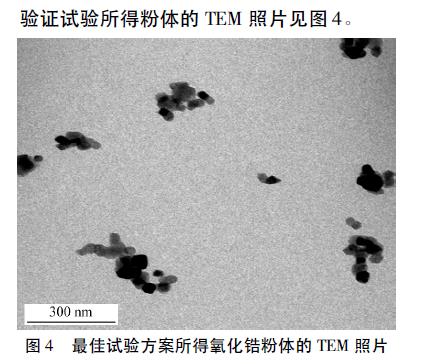 对最佳组合A1B2C2D2进行了3 次验证试验,结果分别为0. 309、0. 312 和0. 310 μm,平均值为0. 310μm,重复性好,且与2 号正交试验结果0. 305 μm 接近,验证了所选最佳工艺参数的合理性。验证试验所得粉体的TEM 照片见图4。