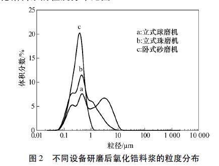 2. 1 不同研磨设备对研磨效果的影响采用不同设备在相同研磨条件下研磨得到的氧化锆料浆的粒度分布见图2。