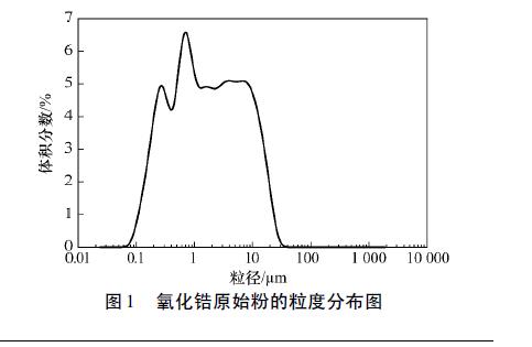 烘干、煅烧获得氧化锆原始粉。经粒度分析( 见图1) ,氧化锆原始粉的d50 = 1. 355 μm,d90 = 9. 440 μm。