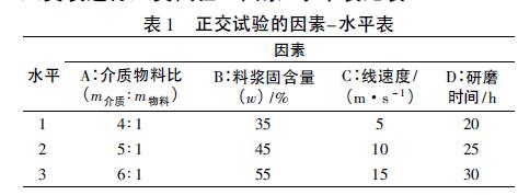 取氧化锆原始粉,分别采用卧式砂磨机、立式珠磨机和立式球磨机,以2mm的氧化锆球作为研磨介质( m介质∶ m物料= 5∶ 1) ,以纯水作为分散介质( 料浆固含量( w) 为45%) ,研磨15 h 后,采用Bettersize2000 智能激光粒度仪检测研磨后料浆的粒度分布,以确定最优研磨设备。选择最优研磨设备,以2 mm 的氧化锆球作为研磨介质,选择介质物料比、料浆固含量、线速度和研磨时间作为试验因素,并各取3 个水平,选择L9( 34 )正交表进行正交试验。因素-水平表见表1。