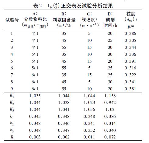2. 2 卧式砂磨机研磨工艺参数对研磨效果的影响采用卧式砂磨机研磨氧化锆粉体的正交试验结果见表2。由表2 可知,研磨时间对研磨效果影响最大,线速度影响次之,其他两个因素影响较小。由粉体粒度和极差分析得出的最佳组合均为A1B2C2D2,即介质物料比( m介质∶ m物料) 为4∶ 1,料浆固含量( w) 为45%,线速度为10 m·s - 1,研磨时间为25 h。