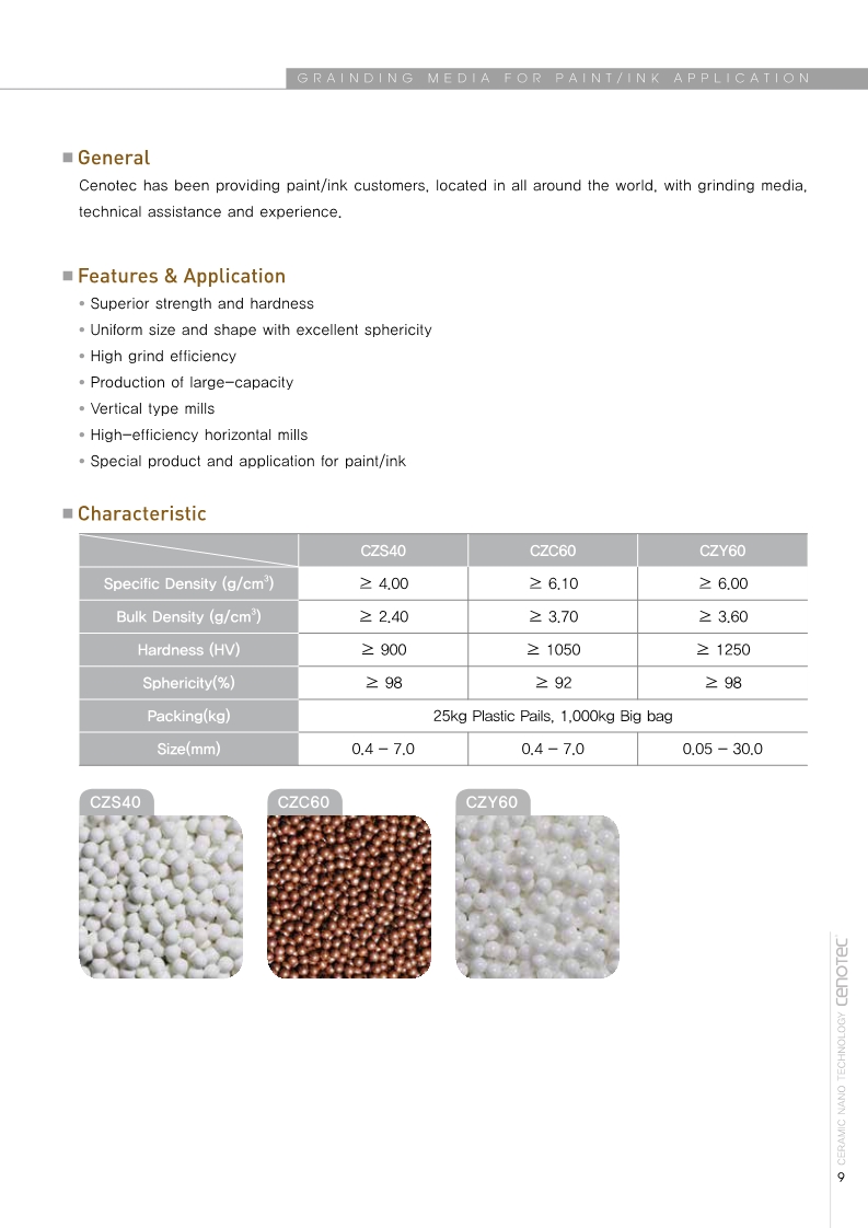 赛诺硅酸锆珠中等的硬度和密度适合中低黏度的研磨和分散,可匹配大部分的砂磨机,为通用的研磨介质。其中小粒径的珠子被用作高档的抛光和去毛疵的喷丸。