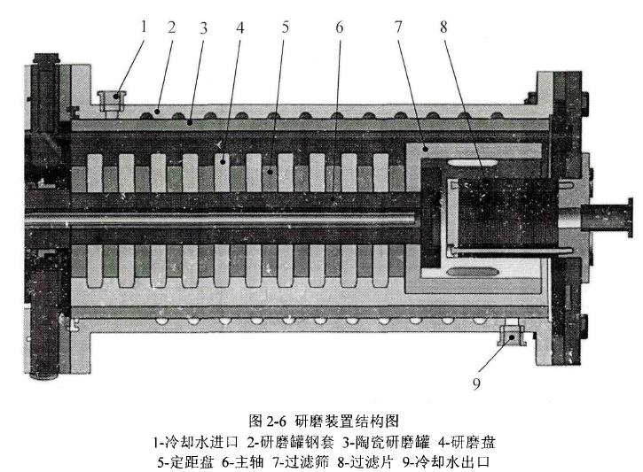 砂磨机的研磨装置见图主要由研磨筒、主轴、研磨盘、定距盘、蹄网、送料菜等组成。待加:丨:研磨的物料柴液由送料呆吸入,从进料丨送入研磨简内,简内装有一定分比视物料浆液的粘度而定的研磨介质。电机通过带轮驱动主轴并带动研磨片进行高速旋转,料衆受到研磨片的搅动,随同研磨介质在研磨筒内剧烈运动,在研磨盘和研磨介质的共同作用下,料装的颗粒受到强烈的磨擦、撞击、挤压、剪切等作用,被迅速研磨成粒径较小的粉末并均匀分散开。为了满足生产要求,整个生产过程要连续进行,所以要采用连续进料、研磨、出料的生产方式。分散后的物料经蹄网流出,从出料口进入出料槽。