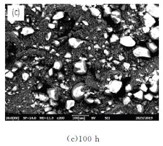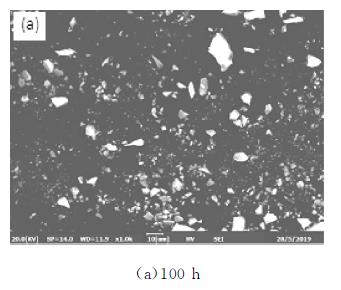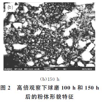 2.3 球磨150h后锆英粉的筛分粒度组成表1为球磨锆英粉的筛分粒度组成。由表1可知,通过150目至1 000目各个目数筛分均有粉体分布。在-200+400目区间,粉体占整个重量的80%以上,而且通过1 000目的颗粒,即小于10μm的颗粒也占有一定比例,这说明细粉有堆积现象,也说明了图3曲线中出现“翘尾”的原因。