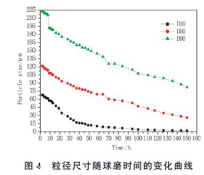 将球磨不同时间的样品经激光粒度仪分析获得的粒径尺寸,利用Origin分析软件,绘制随球磨时间的增加粉体D10,D50及D90的变化曲线,结果如图4所示。图4中三条曲线均平缓下降,其中D50和D90变化趋势相近,而D10在35h后随时间的延长变化趋于平缓,呈水平状态。此种情况是由于当球磨机的转速较低时,氧化锆球基本处于半抛状态,粉体颗粒主要靠磨削减小尺寸,但是较粗颗粒有随机被破碎的可能;当细小的颗粒小于15μm 后,由于颗粒的团聚作用和表面积的迅速增加,导致球磨速率下降,这就是粗粉的下降趋势快于细粉的基本原因。而且由于粗粉逐渐被球磨成细粉,而细粉球磨的速率下降,导致细粉堆积,造成细粉端出现“翘尾”现象。