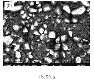 氧化锆球作为球磨介质,级配比例为直径20 mm/16 mm/10mm/6mm,球料比为1∶1,实验时间为150h,间隔不同时间取样分析。利用台式扫描电子显微镜(COXEM-30)观察粉体的形貌特征;利用BT-9300ST激光粒度仪测试球磨不同时间锆英粉样品的粒径分布及主要参数值;利用XSB-88型顶击式震筛机测量粉体的筛分目数及所占比例,震动时间为5min,每次称重100g筛分,求其平均值。最后,将锆英砂、球磨生产的锆英粉及实际雷蒙磨生产的锆英粉按质量百分数分别称得300g,自然沉积24h后量取其体积大小,计算并比较其堆积密度。