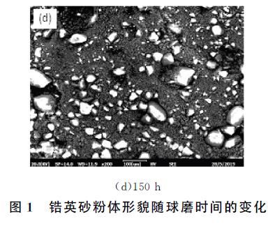 (1)锆英粉呈不规则形状,随着球磨时间的延长,其粒径正态分布曲线左移,并出现“翘尾”现象;