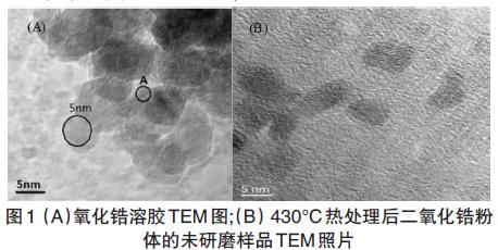 实验采用新颖的纯水基溶胶-凝胶法制备ZrO2纳米粉体,即在溶胶的前驱体配置过程中不引入有机物而全部引用水溶液,通过控制溶胶的浓度、加热、研磨及加水震荡等工艺参数,制备出高纯超细的ZrO2纳米粉体,采用透射电子显微镜对胶体的形貌进行观察,同时取样做TGA、DSC,再经过加水震荡后采用激光粒度分析,并对粉体的粒径进行测量。实验流程是以HfOCl2·8H2O为原料,用去离子水制成一定浓度的原料液,搅拌条件下滴加沉淀剂制成水合ZrO2胶体,再于80°C恒温加热1h 之后,去除掉大量水形成的白色块状固体,在通过加热炉加热至430°C后产生的白色块状固体进行研磨,通过玛瑙研钵研磨过后把产生的白色粉末再进行加水震荡。经过溶胶加热、研磨、震荡过后,最后在铜网取样采用透射电子显微镜分析对粉体的物相结构进行分析。