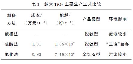 硫酸法生产,经过多年的发展,技术发展得比较成熟。硫酸法生产纳米TiO2的原料来源丰富,对原料的品位要求低,设备及操作较简单,但该工艺流程长、操作工序多,其最大的问题是环境污染严重,随着环保的要求越来越高,除了发展中国家外,欧美发达国家和地区的很多硫酸法工厂已经关闭[7]。正因如此,氯化法相比于液相法、硫酸法而言是生产和工艺技术的进步,其生产工艺流程较短、机械化程度高,可以高效率地连续生产,得到的金红石型纳米TiO2晶粒纯度高、颗粒分布均匀、粒径分布窄,直接排放的废弃物少,有利于环境保护,现已成为国际纳米TiO2工业的主流工艺[8]。