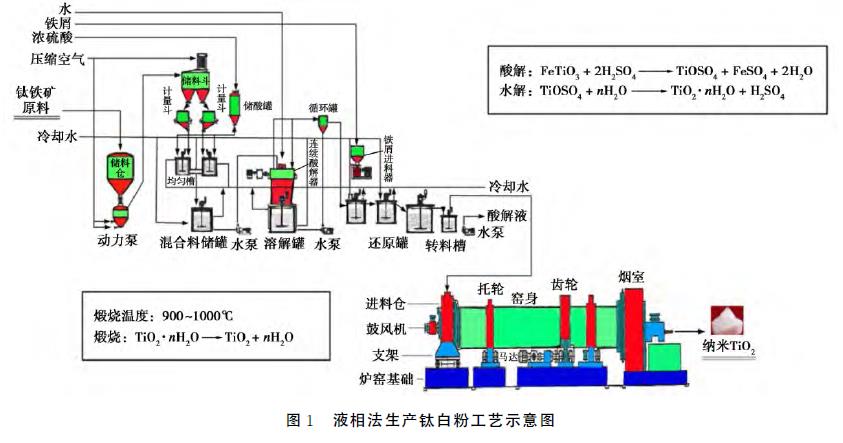 液相法制备纳米TiO2的缺馅限制了其在工业上的推广应用,而硫酸法在纳米TiO2早期生产实践中很好的填补了这一空白,成为生产纳米TiO2的主要方法之一。该法对原料钛铁矿或酸溶性钛渣的品位要求不高,上个世纪引入我国后得到迅猛发展。其基本原理为使用浓硫酸将原料酸解后得到硫酸钛氧溶液,酸解后的溶液经过水解后生成偏钛酸沉淀,得到的沉淀在转窑中煅烧后为TiO2粉末,将TiO2进行表面处理即得到产品.