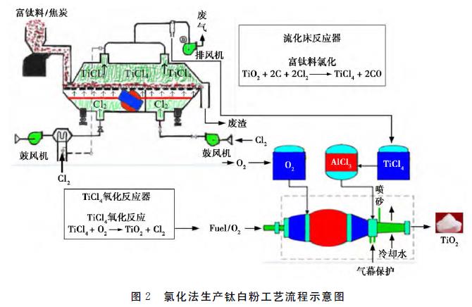 国外很早就开始了对氯化法钛白粉生产工艺的研究,自1932年德国法本公司首次提出此法以来,经过几十年的发展,氯化法钛白的生产技术日趋成熟[21-22]。氯化法生产钛白粉工艺技术难度大,生产设备较为复杂,对矿石原料的品位及生产设备耐高