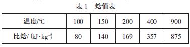 针对本项目,干式排渣系统中的高温底渣冷却主要是在底渣下落干渣机的垂直段和锅炉底部的水平段上完成的,因为底渣在喉口处的温度有950 ℃,温压相当大,所以发生的辐射换热非常强烈。下落过程中的底渣与冷却空气接触充分,换热面积大,有利于热交换,同时对流换热量也很大,当底渣下落到锅炉喉部时,底渣温度迅速下降到440 ℃,自然空气在锅炉喉部也被加热到400℃左右。渣温对应的焓值见表1