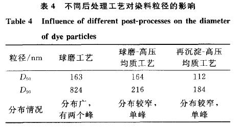 再沉淀一高压均质法优点在于染料粒径不受物理分散极限的约束,可通过在再沉淀步骤中加入分散剂来控制粒径的大小,操作灵活,能有效地减小染料粒径,得到均一稳定的染料液.综合考察三种后处理工艺对染料粒径的影响,结果见表4.较球磨工艺,后两种工艺中的染料悬浮液经高压均质后,D。。显著减小,说明少量未被球磨磨碎的大颗粒染料已破碎.此外,可以看出再沉淀一高压均质工艺较其他两种工艺能明显减小粒子粒径.