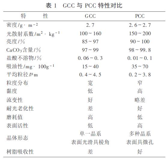 关, 见表1。更多的造纸商认为PCC 用于造纸价格昂贵, 尽管卫星式PCC 生产装置的建立使填料级PCC打开了市场, 局面有所改善, 但至今涂料颜料GCC 仍占有统治地位。