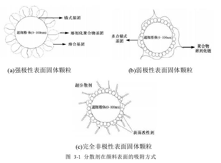高分子型超分散剂:是指摩尔质量在数千以上(一般为 103~106g/mol)并具有一定表面活性的物质。由于它们的锚定基团一头与树脂缠绕吸附,另一头又与颜料粒子包附,因此储存稳定性较好。