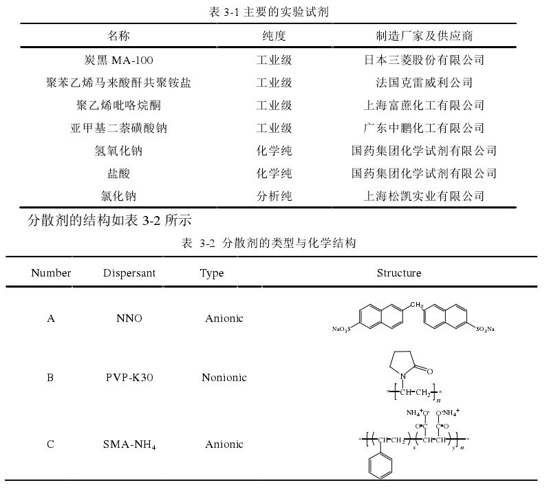 一般情况下,分散体系中的多数固体颗粒带的负电荷,基于同种电荷相斥的原理,在水中添加阴离子表面活性剂能增加固体颗粒之间的排斥力。起到使固体颗粒在水中静电稳定的效果。阴离子表面活性剂的缺点是对分散体系中的电离度和 p H 值较灵敏。阴离子表面活性剂具有较好的降粘效果,当表面活性剂吸附在颜料表面达到饱和后能形成稳定的双电层。当表面活性剂的用量不足,表面活性剂在颜料表面的吸附没有达到饱和,提供静电斥力不能保证色浆的稳定。当加入的表面活性剂过量时,溶解在水中的表面活性剂解离,增加了体系的离子强度,压缩碳黑粒子表面的双电层厚度,使体系的稳定性变差。
