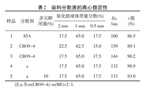 对比样品4和样品5,并联系图1可以看出,多元醇的加入虽然不能减小染料粒径,但可以提高体系的离心稳定性,增加球磨效率,这主要是由于多元醇的加入有利于染料表面的浸润,同时增加了体系的粘度.