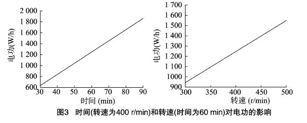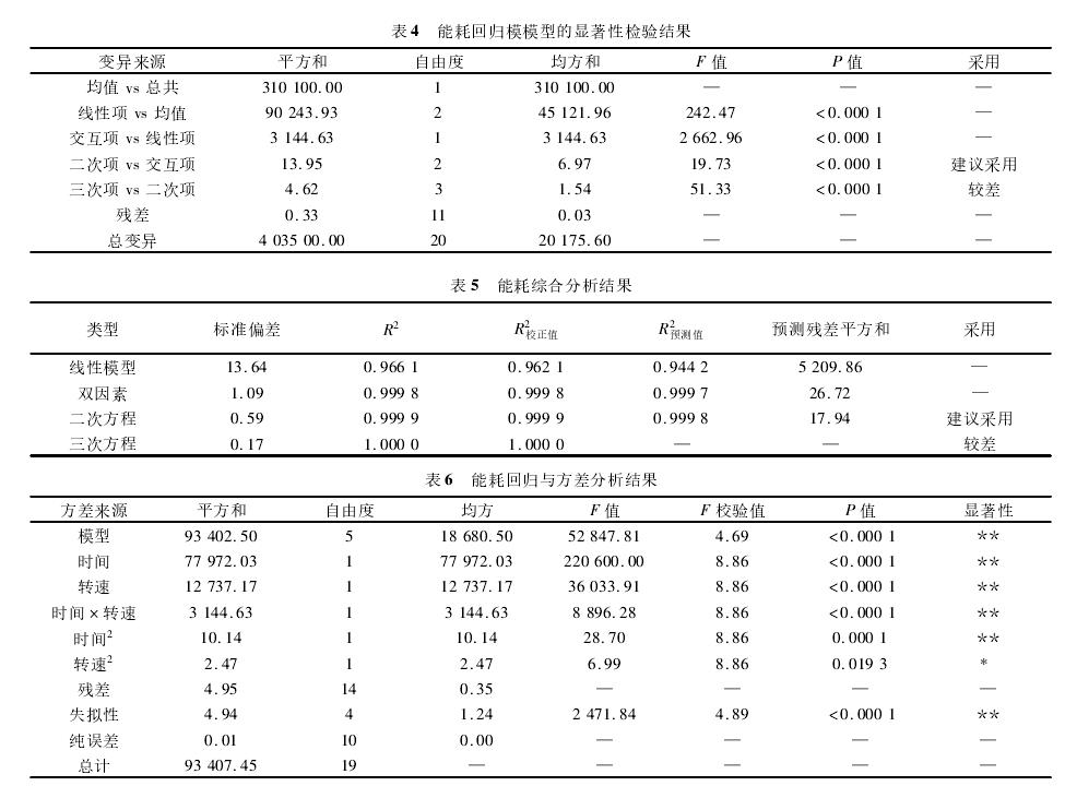 由表 4、表 5 可知,采用二次项模型对能耗的预测准确性好,能解析 99. 99% 的试验数据,所以对能耗模型选择二次函数。由表 6 可知,模型、时间、转速、