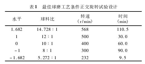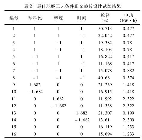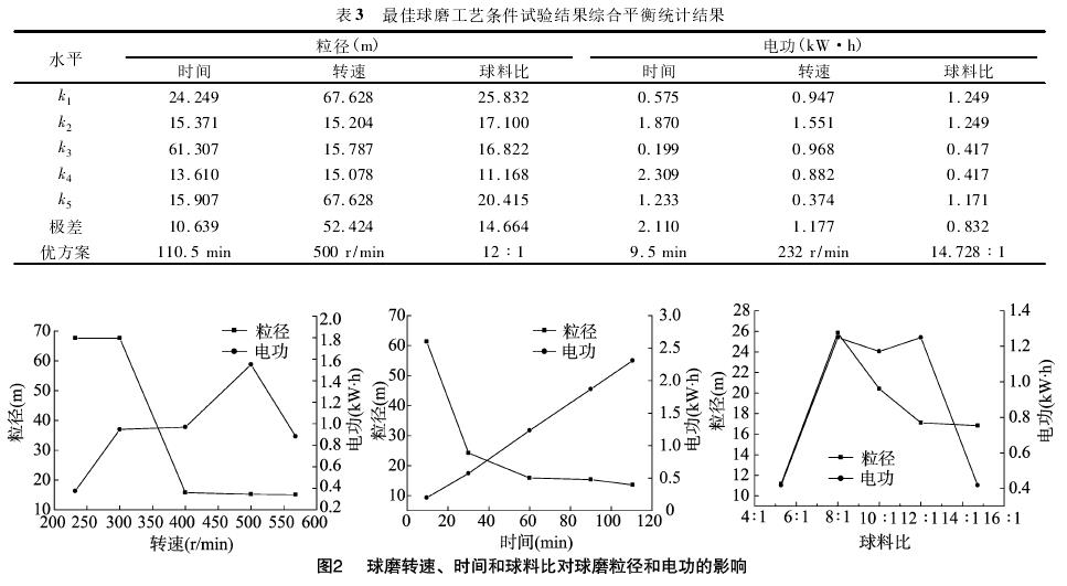 通过 3 因素二次回归正交旋转组合设计试验,对粒径和电功 2 个指标进行综合平衡法分析,得出最优组合工艺参数为: 转速 400 r/min、时间 90 min、球料比 4 ∶ 1;各个因素对粒径和能耗 2 个指标的影响主次关系为: 转速 >时间 > 球料比。