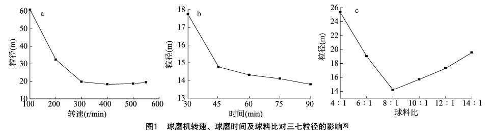 由图 1 可以看出,球料比应当控制在 ( 8 ~ 12 ) ∶ 1 之间,转速在 300 ~ 500 r/min 为宜,粉碎时间为 0. 75 ~ 1. 50 h为宜。