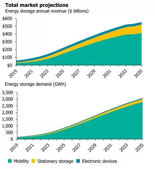 Lux Research发布了一份名为“Global Energy Storage Market Forecast 2019”的报告,预测未来15年,全球储能市场装机容量将以更快的速度增长,到2035年,累计装机规模将达到3046GWh,年复合增长率为20%,年收入将达到5460亿美元,年复合增长率为14.9%。