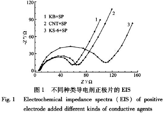 不同种类导电剂正极片的三电极体系的EIS见图1。