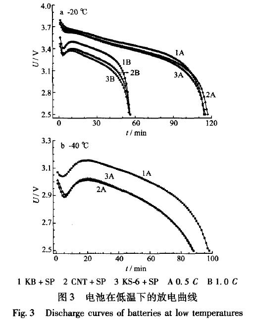 从图3可知,电池在一20℃下放电到2.5 V时,输出容量相差很小。KB+SP、CNT+sP和KS-6+sP作为导电剂的电池0.5 C放电的电压平台分别为3.45 V、3.41 V和3.40 V,1.0 C放电的电压平台分别为3.40 V、3.30 V和3.25 V。在一4|D℃时,KB+sP作为导电剂的电池,放电性能较好,0.5 C放电到2.5 V时,放电初期的低波电压为3.04 V,电压平台为3.06 V,输出容量为1.31 Ah,达到常温容量的80% 以上。KB的多孔穴结构具有较大的吸液量,与sP混合作为导电剂,能较好地吸附和保持电解液,减轻极化 J,因此电池的低温放电性能较好。
