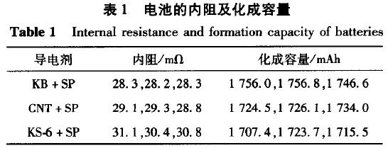 KB+SP、CNT+sP和KS-6+SP作为导电剂的电池内阻和化成容量列于表1。