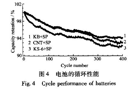 导电剂对电池循环稳定性的影响较为明显,KB+SP、CNT+SP和KS-6+sP作为正极导电剂的电池以1 C在3.O~ 4.2 V充放电400次时,容量保持率依次为94.15% 、93.07% 和92.30% 。