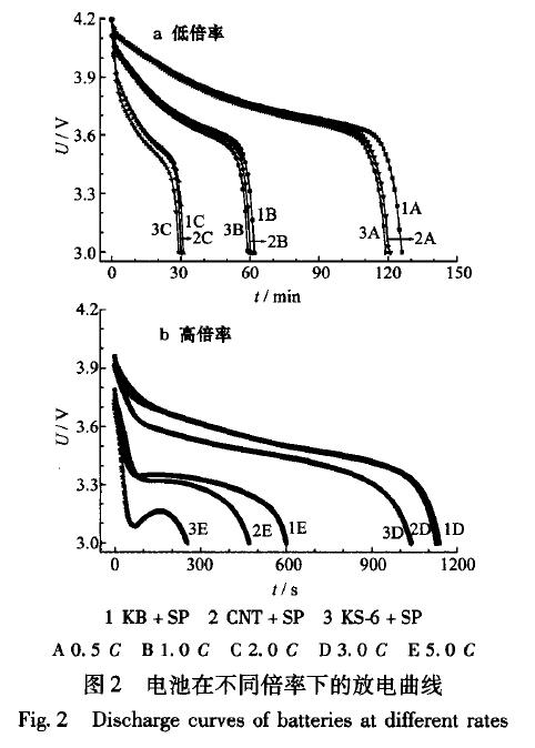 从图2可知,低倍率放电时,电池的电压平台和输出容量相差不大;高倍率5.0 C放电时,KB+sP作为导电剂的电池,电压平台最高(3.32 V)且输出容量最大(1 458.3 mAh)。KB的多孔穴结构能存储更多的电解液,高倍率放电时更有利于Li 在电极中的运输,从而减轻电极极化 。