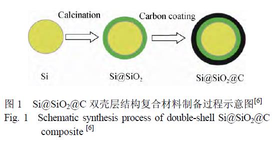 Tao 等[6]通过在硅纳米颗粒表面包覆SiO2 和热解碳,制备出具有双壳层结构的复合材料(Si@SiO2@C),见图1。与单壳层Si@C 相比,Si@SiO2@C 具有更高的容量保持率,在0.01~5 V 电压范围内循环100次后仍具有785 mA·h/g 的可逆容量。研究表明,中间层SiO2 作为缓冲相,可进一步减小循环过程产生的膨胀应力;同时,SiO2 层还可与扩散的Li+发生不可逆反应,生成Si 和Li4SiO4 合金,进一步保证了