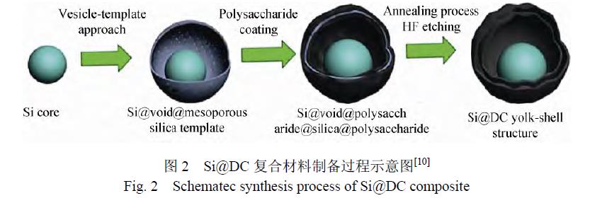 Sun 等[10]通过囊泡模板法制备出Si@void@SiO2材料,并在多孔SiO2 壳层内外侧涂覆多糖,在惰性气氛下高温热解得到Si@void@C@SiO2@C,经HF 刻蚀除去SiO2 后, 得到具有双壳层结构(Si@void@C@void@C) 的蛋黄– 壳型复合材料(Si@DC),见图2。双碳层的引入使材料具有更为优异的导电性能。在50 mA/g 电流密度下,Si@DC 在循环80 次后的放电比容量保持在943.8 mA·h/g,而硅/单壳层(Si@SC)和纯硅颗粒在循环80 次后容量则分别降低至719.8 和115.3 mA·h/g。