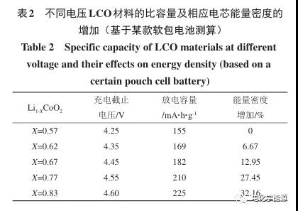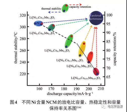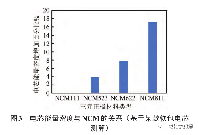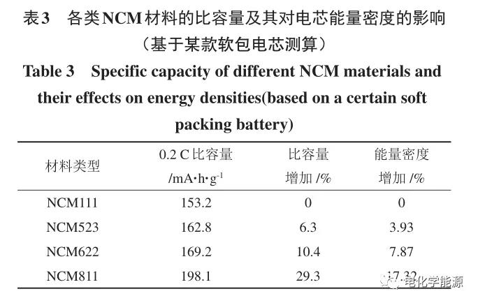 NCM 和 NCA 正 极 材 料 的 理 论 容 量 约 为275 mA·h/g,具有类似于 LCO 的 α-NaFeO2结构。NCM又称为三元材料,根据其中Ni、Co、Mn元素的比例来划分,三元材料已由最初的NCM111逐步 换 代 成 NCM424、NCM523、NCM622、NCM721、NCM811、NCM90/0/5 等,这样的发展趋势是因为在NCM材料中Ni和Co是主要的活性材料,Mn在充放电过程中维持材料的稳定性,一般不参与电化学反应。考虑到Co的价格以及Mn的非活性或弱活性,Co、Mn含量应逐渐降低,Ni含量应不断提高(表3) 。图3展示了三元材料中Ni含量升高对电芯能量密度的影响。
