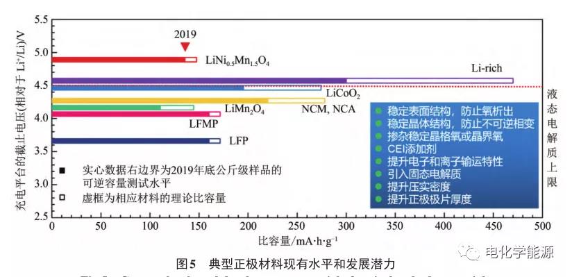目前主流的正极材料中,磷酸铁锂(LFP) 、磷酸锰铁锂 (LFMP) 的现有比容量可达 160~165 mA·h/g,接近理论极限170 mA·h/g,比容量已经没有明显的提升空间;高电压锰酸锂(LMO)正极材料的比容量理论上尚有进一步提升的可能,钴酸锂(LCO) 、镍钴锰酸锂(NCM) 、镍钴铝酸锂(NCA)和富锂锰基(Li-rich)正极材料比容量的提升空间相对较大。图5展示了典型正极材料的充电截止电压、现有比容量以及理论比容量。当然,提升上述材料比容量的同时,还需解决材料稳定性、材料和电解质界面稳定性等问题,并进一步优化极片设计;高电压LCO、LMO以及富锂锰基正极材料的充电截止电压已超过传统液态电解质电压窗口的上限(目前是 4.50 V,参见图 5 虚线标注) ,需要现有电解质的改性或者逐步过渡到固态电解质。