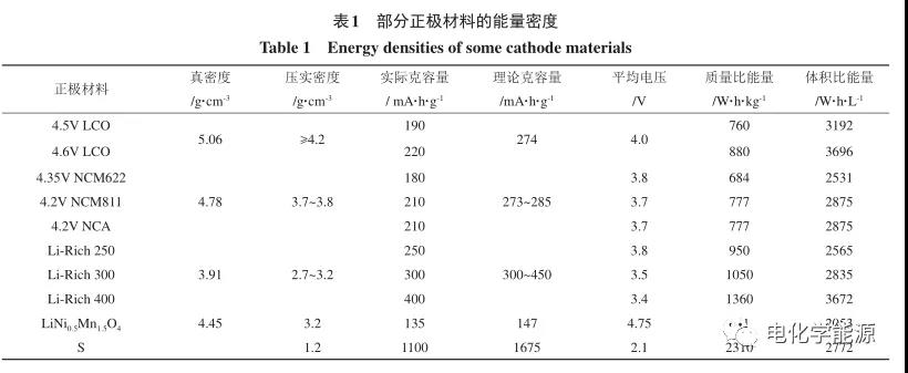 目前,商业化锂离子电池正极材料以钴酸锂(LCO) 、磷酸铁锂(LFP) 、锰酸锂(LMO) 、镍钴锰酸锂(NCM)和镍钴铝酸锂(NCA)为主。自2012年以来,商业化锂离子电池单体的能量密度已经由120 W·h/kg提升到300 W·h/kg,能量密度的提升得益于高比能正负极材料的发展。为了进一步提升锂离子电池的能量密度,正极材料需要从三方面考虑:一是开发低电位下能实现高比容量的正极材料,例如高镍正极材料;二是提高正极材料的脱嵌锂电位[1]从而实现更高容量,例如高电压的LCO、NCM和富锂锰基层状氧化物正极材料;三是开发工作电压高的正极材料,例如镍锰酸锂尖晶石正极(LNMO)。表 1 列出了部分正极材料的能量密度,可以看出高电压LCO(电压≥4.5 V) 、更高镍含量(Ni>0.80)或更高电压(电压≥4.35 V)的NCM和NCA、富锂(Li-rich)锰基正极材料以及无锂正极材料(例如S)是最有希望提高能量密度的发展方向。