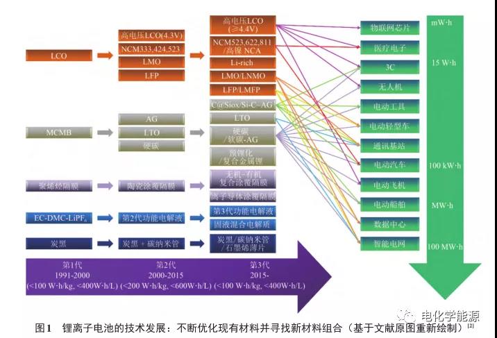 锂离子电池作为当前最重要的电化学储能器件之一,其应用范围已经从小容量电池在消费电子产品、电动工具上的应用,逐渐扩展到新能源电动汽车、电动船舶、电动飞机、机器人等新兴领域,这些领域不仅要求锂离子电池具有更大的容量,对其能量密度也不断提出更高的要求。最初,索尼公司1991年商业化的锂离子电池能量密度只有80W·h/kg;现如今,锂离子电池的能量密度已达到300W·h/kg。在过去,锂离子电池能量密度随时间的提升基本满足线性关系,但近年来,能量密度的提升速度逐渐放缓。目前,世界各国提出的锂电池发展计划大多按照能量密度线性提升的速度制定研发标。中国、美国、日本政府都计划在2020年开发出能量密度达400~500W·h/kg的电池原型器件,并在2025-2030年实现量产。锂离子电池能量密度的提升建立在不断优化现有材料并寻找新材料组合的基础上。材料的选择决定了锂离子电池能量密度的理论值。正负极材料是锂离子电池的活性储能材料,提升能量密度的本质在于提升正负极的电势差和材料的比容量。由于应用的多样性导致性能指标要求的多样性,锂离子电池未来还会是多种材料共同发展的局面。正极材料主要是对现有钴酸锂(LiCoO2)、三元层状(NCM/NCA)、富锂锰基(Li-rich或者OLO)、锰酸锂(LiMn2O4)、镍锰酸锂(LiNi0.5Mn1.5O4)正极材料的进一步优化和更新换代。