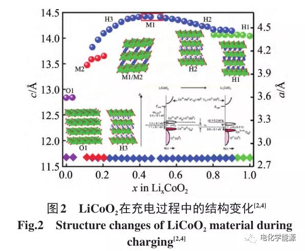 钴酸锂正极材料LCO是在消费类电子产品应用中占据主流的一款正极材料,理论容量为274 mA·h/g。常用的层状LCO为α-NaFeO2结构,属于六方晶系,晶格中O原子为立方密堆积排列占据6c位,Co和Li交替分布于O层两侧,分别占据氧八面体空隙的3b和3a位。商用LCO的电压已经由最初的4.2 V逐步提升到了4.48 V,目前研究人员正在开发 4.50 V、4.53 V、4.55 V、4.60 V等更高电压的LCO正极材料,随着电压进一步提升至4.5~4.6 V,LCO正极的比容量和相应电芯的能量密度也会继续提高 。但是高电压下脱锂造成了H3→M2相变,如图2所示,并且随着Li+脱出,Co3+不断被氧化成Co4+,且高度脱Li时Co4+溶解在电解液中,产生Co的溶出;另一方面高度脱锂时电子从O2-2p带逃逸形成高氧化性的氧,造成 LCO 表面析氧,引起安全性问题,同时导致结构不稳定并伴随着较大不可逆容量损失。现有的改性手段希望把H3→M2相变对应的电压平台提高,并利用体相和晶界掺杂以及表面包覆来减少Co溶出和表面析氧。