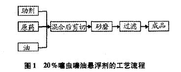 1.2.1 油悬浮剂的配制。按照一定量的配比,首先将原药、助剂、油加入砂磨斧中,用高速剪切分散机进行预分散3min,将其料浆中大颗粒打碎,使其粒径至少小于砂磨介质的直径。然后通人冷凝水,开动砂磨机研磨3 h,用LS—POP(Ⅲ)激光力度分布仪检测,直至达到所要求的粒度为止,过滤,进行各项技术指标的分析检测。工艺流程见图1。