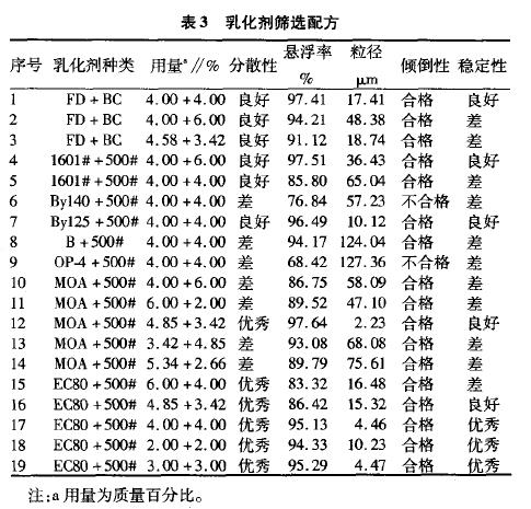 MOA、EC80、Byl40、By125、EL一60、B、OP4、FD、BC、OP一10、EL·80、BY一125、OP一7、MOA一3、100#、1602#共18种乳化剂进行了初步测定与筛选,最终选择500#、农乳1601、MOA、EC80、Byl40、By125、B、OP-4、FD、BC共1O种乳化剂用于试验。由表3可知,17号、18号、19号乳化剂组配后均符合各项指标,其中19号不但减少了用量、降低了成本,且其各项指标均符合要求,因此,以EC80+500#作为该油悬浮剂的乳化剂组合,用量(质量百分比)为6.0o% 。