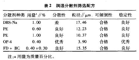此外,所加分散剂的量至少要达到足以完全覆盖农药在砂磨时暴露出来的表面积,这样才能使悬浮液体系稳定。根据噻虫嗪的物化性质及其类似产品加工的研究经验,选用不同的分散剂进行了试验,结果表明OP-4能较好地乳化分散噻虫嗪原油,用量(质量百分比)为0.40%(表2)。