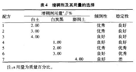 要获得长期稳定的油悬浮体系,最重要的是尽可能地减缓已分散的粒子沉降速度,选择合适的黏度,而黏度通常需要增稠剂来调节。黏度太小,产品放置一段时间后易分层、结块;黏度太大,产品不易倾倒,挂壁严重,给加工和使用带来困难。因此,必须通过筛选试验来优化增稠剂的种类和用量 。筛选了几种增稠剂,其中单一使用黄原胶作为防沉降剂时,所制的油悬浮剂稳定性较差且易分层;将黄原胶和其他防沉降剂混合使用,发现选用白炭黑(质量百分比2.00%)对制剂产品贮存及使用效果最好(表4