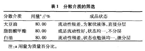 2.1 分散介质的确定筛选适用于油悬剂加工的油类分散介质,主要考虑3点:一是固体原药在分散介质中溶解度低;二是为保证原药在分散介质中高度分散,要求分散介质闪点高、毒性和挥发性低,且有足够黏度;三是应具有 显的增效作用。对挥发性低、价格便宜的大豆油、脂肪酸甲酯、白油进行了筛选,结果表明噻虫嗪在脂肪酸甲酯中具有良好的流动性、状态均一、不分层,对噻虫嗪的热稳定性无不良影响(表1)。因此,选择脂肪酸甲酯作为分散介质。