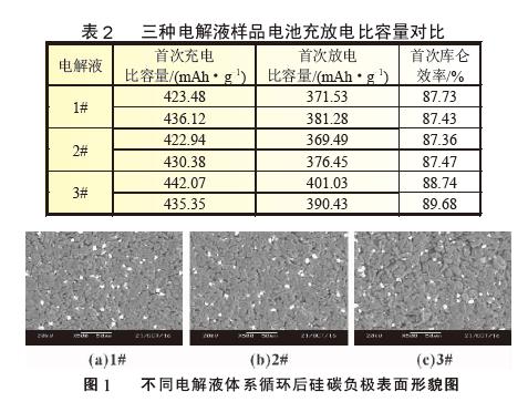 扣式电池采用三种电解液配方(电解液配方见表1)。测试电池电性能, 不同电解液体系下扣式电池首次充放电比容量及首次库仑效率对比见表2。扣式半电池循环5 次后,在手套箱中将其负极片取出, 用流动的EMC 进行冲洗, 清洗后待EMC 挥发完全后,将极片装入自封袋中,进行后续硅碳负极形貌扫描。从表2 硅碳负极放电比容量测试结果可以看出,加入5%的SiO 可以有效提高负极比容量,3# 电解液体系比容量可以达到395.73 mAh/g,说明3# 添加剂在负极片上成膜更为完全、致密,成膜阻抗更低,有利于降低不可逆容量损失。三种电解液首次库仑效率排序如下:3#>1#>2#, 其中1# 电解液和