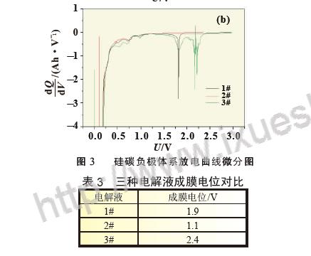 使用SiO-C/Li 扣式半电池以0.01 C 缓慢放电, 并对放电曲线做微分, 观察电解液中添加剂在硅碳负极表面的成膜现象及作用机理,SiO-C 体系0.01 C 放电曲线见图2, 放电曲线微分图见图3。从图2 中可以看出随着放电的进行将存在一个微小的放电平台,其中以3# 曲线最为明显,开始时间较早,说明添加剂在此处有成膜反应, 但1# 和2# 电解液无法从放电曲线上对成膜电位进行准确判断。图3 为SiO-C/Li 扣式电池放电曲线的dQ/dV 曲线,将放电曲线微分后,可以将电极表面的成膜反应放大,便于分析添加剂作用机理,其中图3(b)为图3(a)中Y 轴小量程放大图。从图3(b)中可以准确判断成膜峰的位置及峰面积大小,三种添加剂成膜电位汇总为表3。结合图3(b)和表3 可以看出,LiPO2F2 的成膜电位为2.4 V,成膜反应开始最早,同时成膜峰与其他两种电解液相比峰面积更大,主峰振幅的大小可以反映出成膜反应的强弱, 说明此种添加剂组合成膜反应更完全、更致密,成膜能力更强。2# 电解液中成膜添加剂为FEC,说明FEC 的成膜电位为1.9 V,在3# 电解液中同样含有同比例的FEC, 在微分曲线中同一位置也可以明显看到成膜峰,再次验证了FEC 在此位置可发生成膜反应。而1# 电解液中的添加剂VC 成膜最晚,成膜电位为1.1 V,在硅碳负极体系中成膜能力最弱。对比三种电解液成膜电位可以看出,LiPO2F2 最易在硅碳负极表面成膜,三种添加剂成膜能力排序为LiPO2F2>FEC>VC。由于电极表面所成SEI 膜的质量直接关系到电池循环寿命, 因此从图3 的微分曲线所反应的成膜反应强弱可以对硅碳体系软包电池循环效果进行预测。